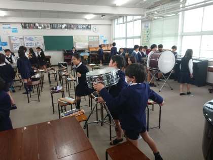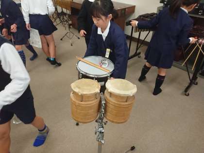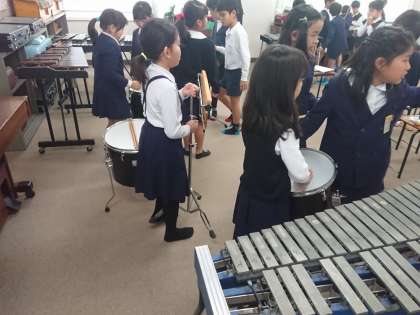 いろいろな楽器を使って、演奏の仕方を考えています。