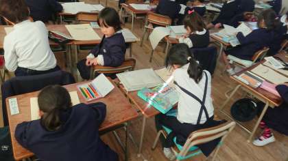 1年生は、ふゆ休みのしおりに色をぬりました。
