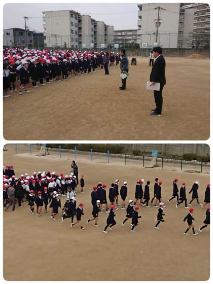 机の下に隠れ、安全が確認できたあと、グランドに集合しました。