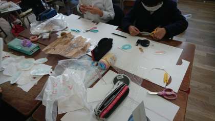 「いろいろうつして」をテーマに、モールや毛糸、わりばしなどの素材を使って版画を作ります。
