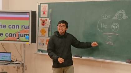 5年生は、ケビン先生と外国語の勉強をしています。