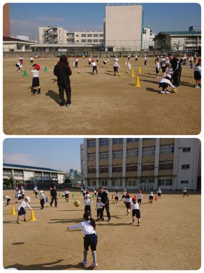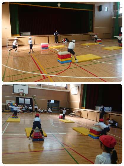 運動場では、ボール運動、講堂では、跳び箱をしました。
