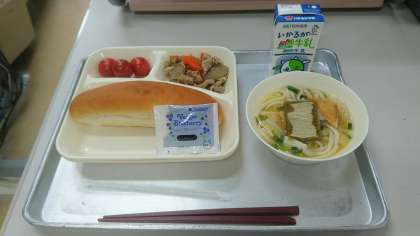 大阪で生まれたと言われるきつねうどんに、大阪で昔から作られている「とろろこんぶ」をのせて食べるうどんを、大阪市の給食では、「なにわうどん」とよんでいます。