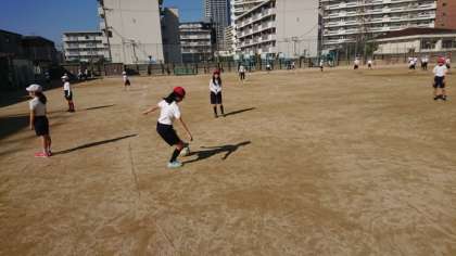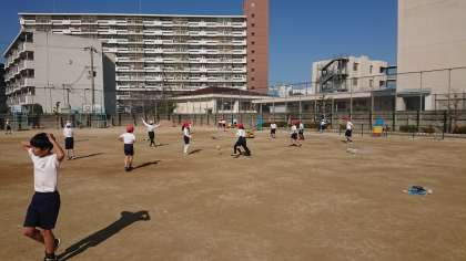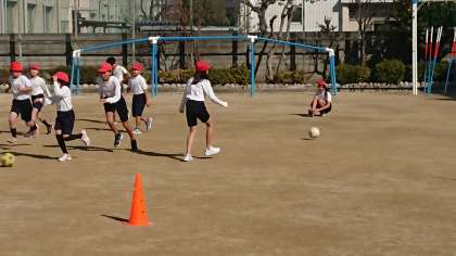 4年生の体育は、運動場をいっぱいに使って、サッカーをしています。
