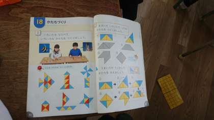 今日は、三角形の板を組み合わせて、いろいろな形を作りました。