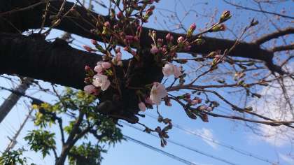 玄関の桜もつぼみがふくらみ、一部が開花しています。