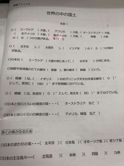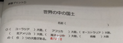 4/27、28日に配付しました課題プリントの解答に誤りがありました。社会の課題プリント1のはじめの〇の5つ目の解答が「(南アフリカ)大陸」となっていましたが、正しくは「(南アメリカ)大陸」です。訂正よろしくお願いいたします。