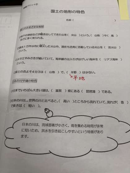 ・社会の課題プリント2 国土のさまざまな地形 の上から4つ目の解答が(山地)で(平野)となっていましたが、正しくは(山地)で(平地)です。