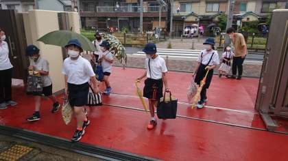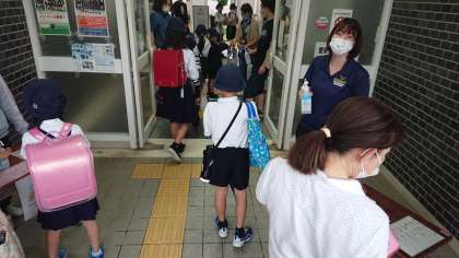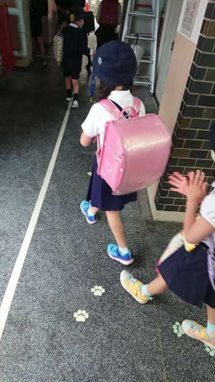 玄関で手指消毒をしたあと、1年生はあしあとをたどって教室に向かいます。