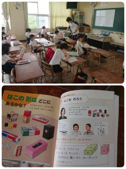 算数では2年生で学習するはずだった、「はこの形はどこにあるかな?」を学習しました。