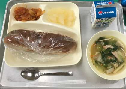 今日は、黒糖パン・牛乳・中華スープ
