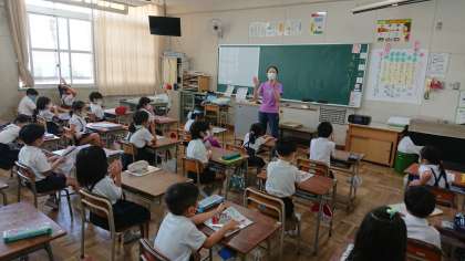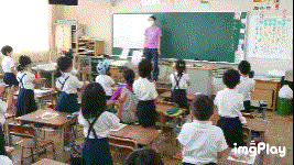2年生の音楽では、先生のリズムに合わせて手や足をたたき、音を出しています。