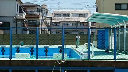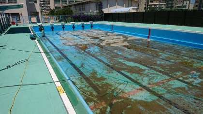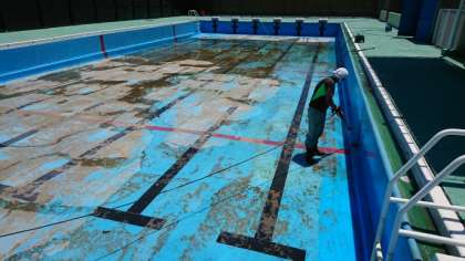 明日のプール清掃の前に、管理作業員さんがプールサイドとプールの壁面を掃除してくださいました。