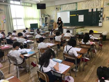 「に」の書き順について学習しました。みんなで空書きをすることができました。