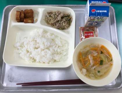 今日の給食は、ごはん、ゴーヤチャンプルー