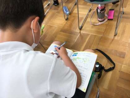 今日は、ジョン先生といっしょに英語学習をしました。天気についての歌をみんなでいっしょに歌い、そのあと、英語の質問を聞いて、問題に答えることができました。