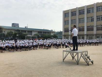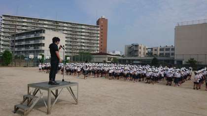 本日の全校朝会は、久しぶりに運動場で行いました。