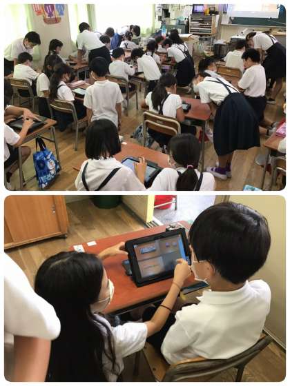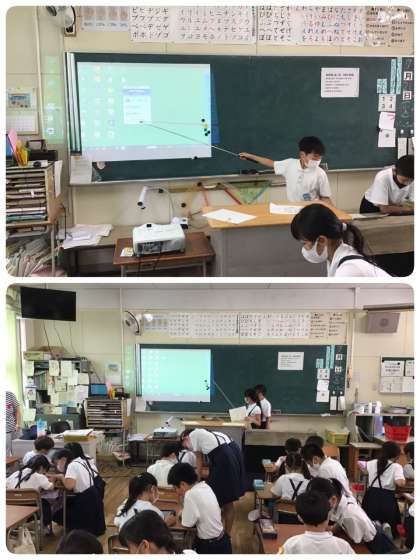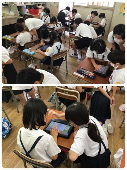 総合の時間に5年生が1年生にタブレットの使い方を教えました。