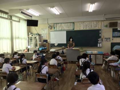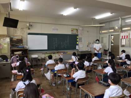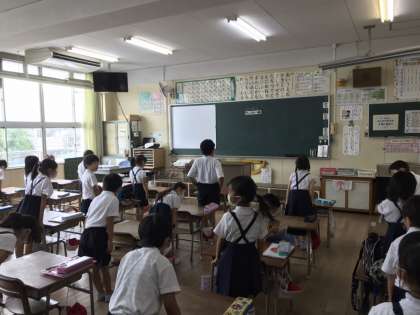 本日の全校朝会は、運動場のコンディションと熱中症対策のため、放送で行いました。