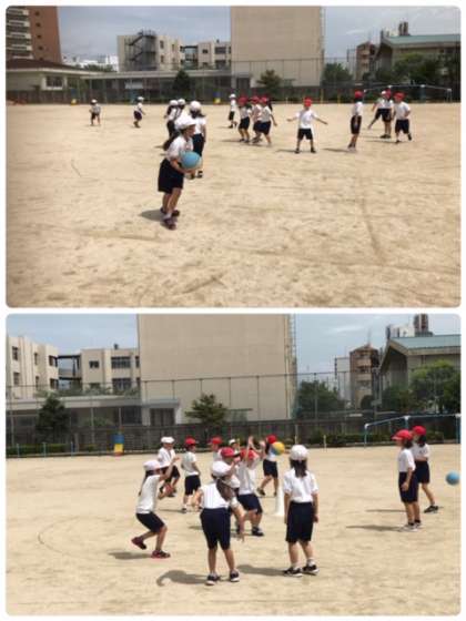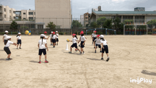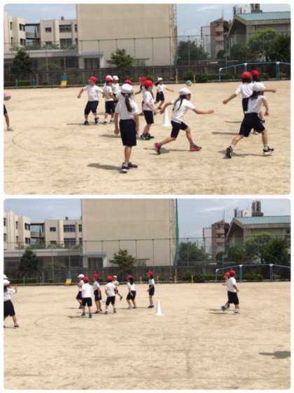 赤組は、コーンを倒されたら負けになります。赤組は、1分間でコーンを倒されず守りきれば勝ちです。どちらのチームも相手チームの裏をかこうと機敏に動くことができました。