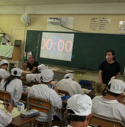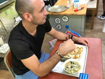 外国語科担当のジョン先生もみんなと一緒に給食を食べています。