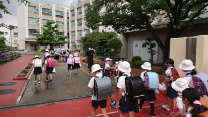 毎日、教職員が横断歩道に立ち、登校する子どもたちを見守っています。