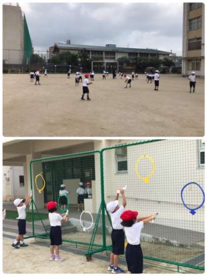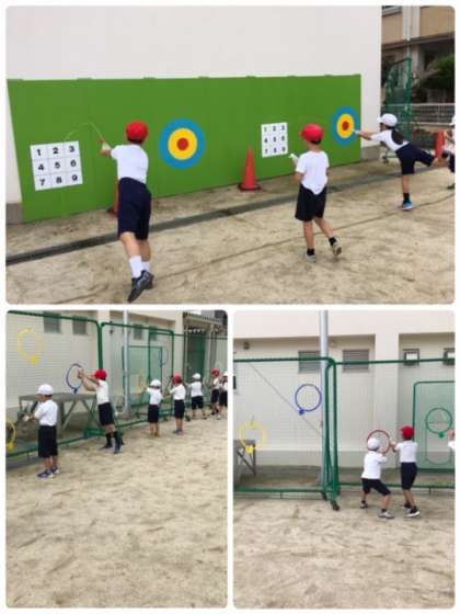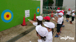 子どもたちは、マヨネーズの容器などを利用した水鉄砲で、的をねらって打っています。うまく当たったかな?