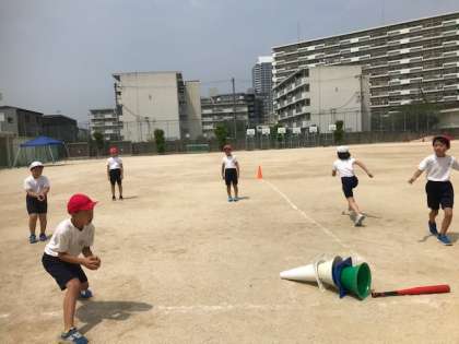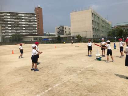 体育科でベースボール型のゲーム運動をしました。攻めるときと、守るときとチームの仲間からの掛け声がよく聞こえてきました。