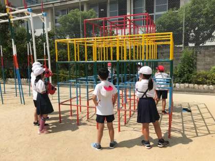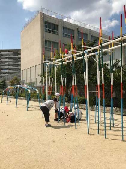 メジャーを使い、ジャングルジムの周り、のぼり棒の長さなどいろいろなものの長さを測りました。