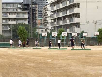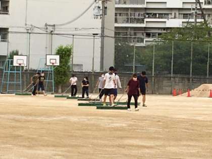 放課後、運動場に砂ぼこりなどを防ぐために、教職員でにがりまきをしました。