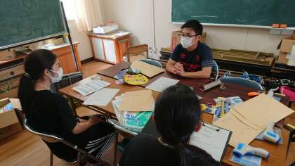 教務主任から、学校の仕事には、どんなものがあるのかについて話を聞きました。