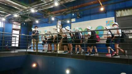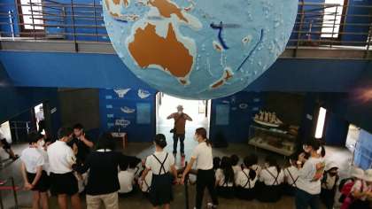 海球儀の下で学級写真を撮影した後、研修棟の見学をします。