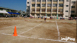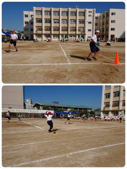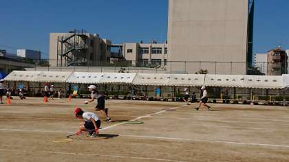 ラグビーボールをバトンにクラス対抗リレーを行います。