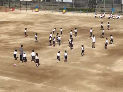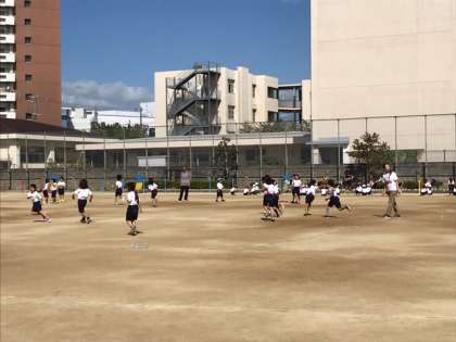 晴れた気持ちの良い空の下、元気いっぱい体育で「しっぽとり」の学習です。