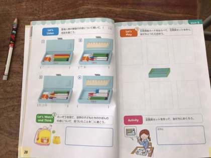 英語を聞き、誰の筆箱か当てます。