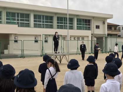 今日の全校朝会は、校長先生のお話のあと、教育実習生から3週間の実習終了のあいさつがありました。