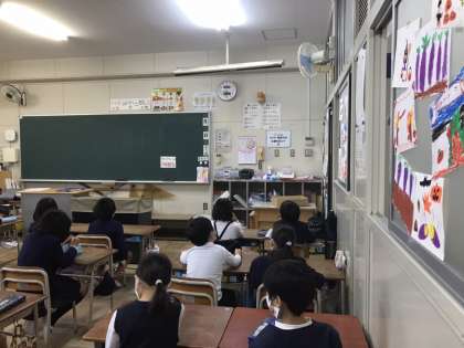 校長先生のお話のあと、集会担当の先生から11月の生活目標「ろうか・かいだんでは右側を歩こう」について、お話がありました。