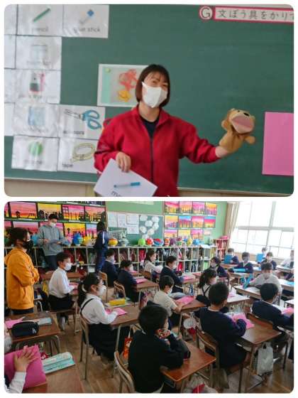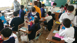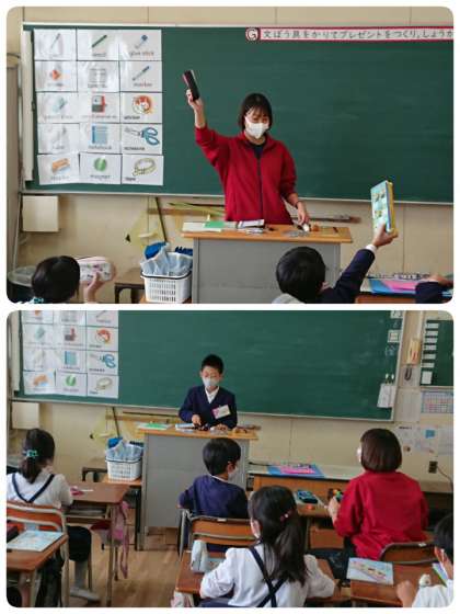 友だちに英語で聞きながら、必要な文房具を集めました。
