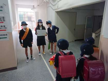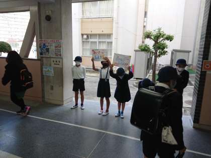 代表委員会の児童が、登校してくる児童たちにあいさつをしています。