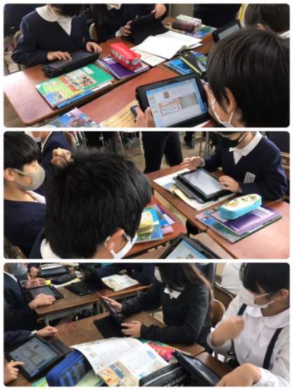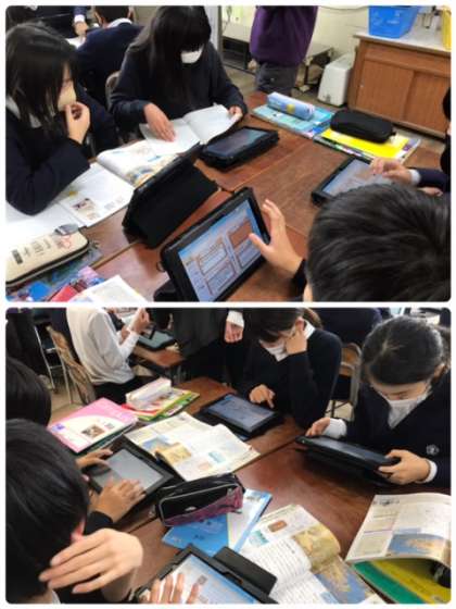 タブレットを使い、個人の意見を書き、その意見をグループで共有しました。