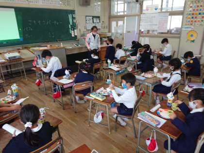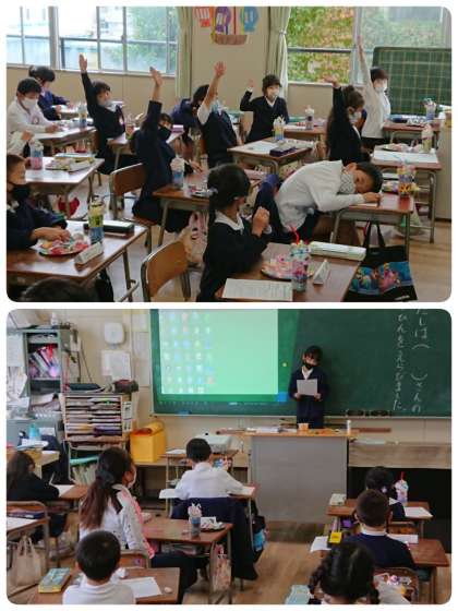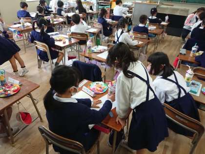 「ごちそうパーティー」で作ったパフェをお互いに鑑賞し、お友だちの作品のいいところを発表しました。