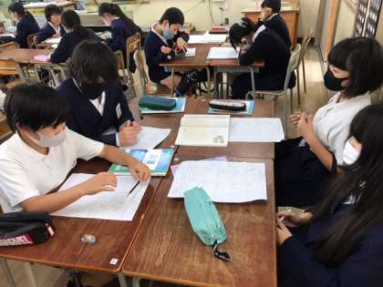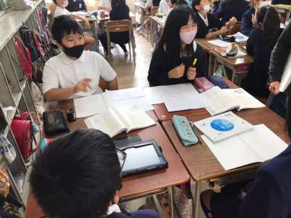 グループで、未来の町についての話をしています。