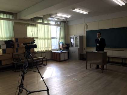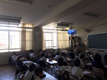昨日の臨時休業を受けて、臨時にテレビ中継による全校朝会を行いました。
