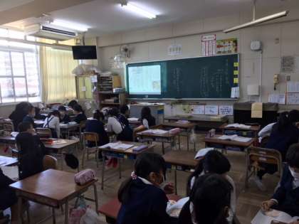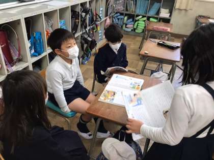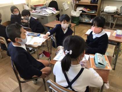 なぜあきらさんがなみだをうかべていたのかをグループで話し合っています。