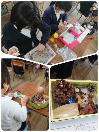 落ち葉やドングリ、松ぼっくりを使って、はこの中に広がる世界を作成しました。