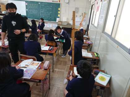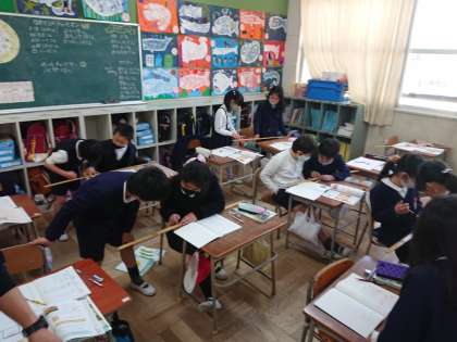 1mのものさしを使って、つくえやロッカーの長さをはかりました。