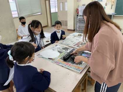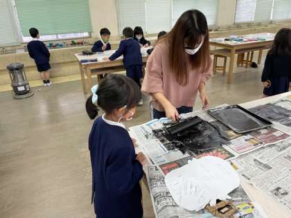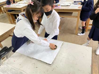 みんな友だちに協力してもらい、一生懸命バレンで擦ります。