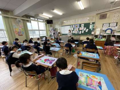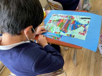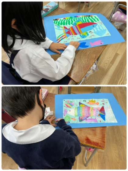 クレパスを使い、色とりどりのお魚がもうすぐ完成です。