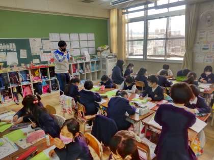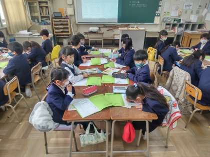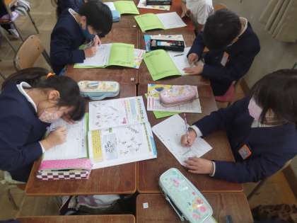 体育の授業で行う「キックベースボール」のチームにわかれて作戦会議を行いました。