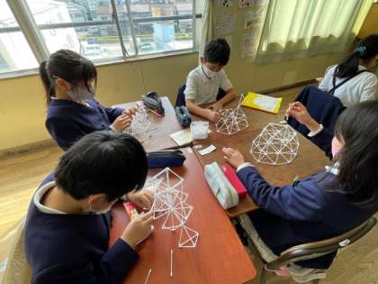 未来の建物や乗り物などをイメージして、めんぼうを組み合わせてはりつけていきます。